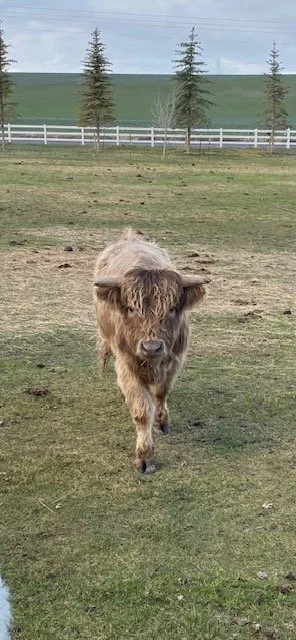 Leo is our newest addition, out of Mango, and a handsome steer with her thick, beautiful coat. He’s still a bit shy, but we’re working with him using grain and treats and he’s making great progress.