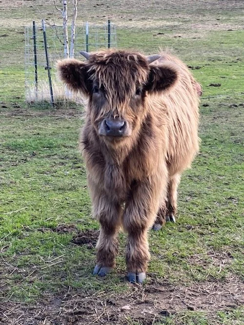 Dakota is a mid-sized Mini Highland who will be welcoming her first calf this spring, sired by Casper. Her unique markings, combined with Casper’s strong frame and fluffy coat, are expected to produce a truly beautiful calf.